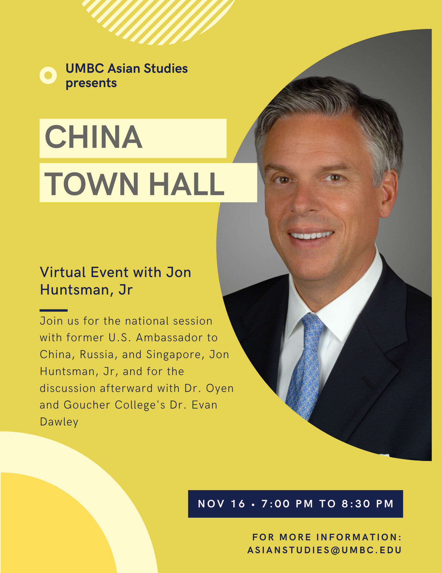 - China Town Hall - Join Dr. Oyen and Goucher College's Dr. Evan Dawley on Wednesday night from 7-9pm for a livestream of the national Town Hall event, followed by a UMBC discussion session. You can find the WebEx link on the IEW schedule page linked above, or you can visit the myUMBC event page.