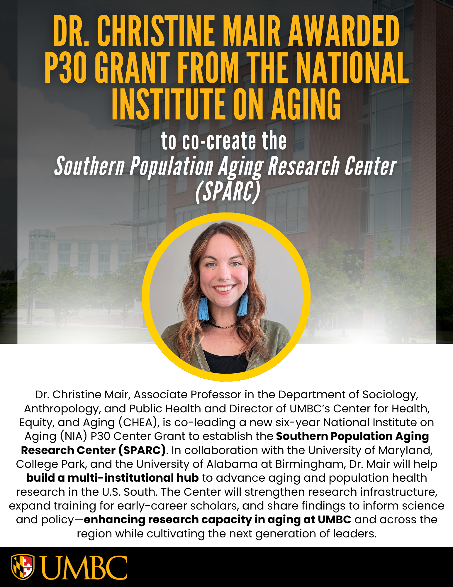 Dr. Christine Mair, Associate Professor of Sociology, Anthropology, and Public Health and Director of UMBC's Center for Health, Equity, and Aging, is co-leading a six-year National Institute on Aging P30 Grant to establish the