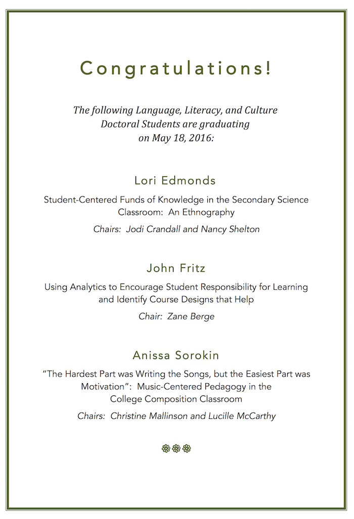 Please join us in congratulating our spring graduates who will be receiving their Ph.D. diplomas during the Commencement Ceremony on Wednesday, May 18th, at 10 a.m. in the Retriever Activities Center.