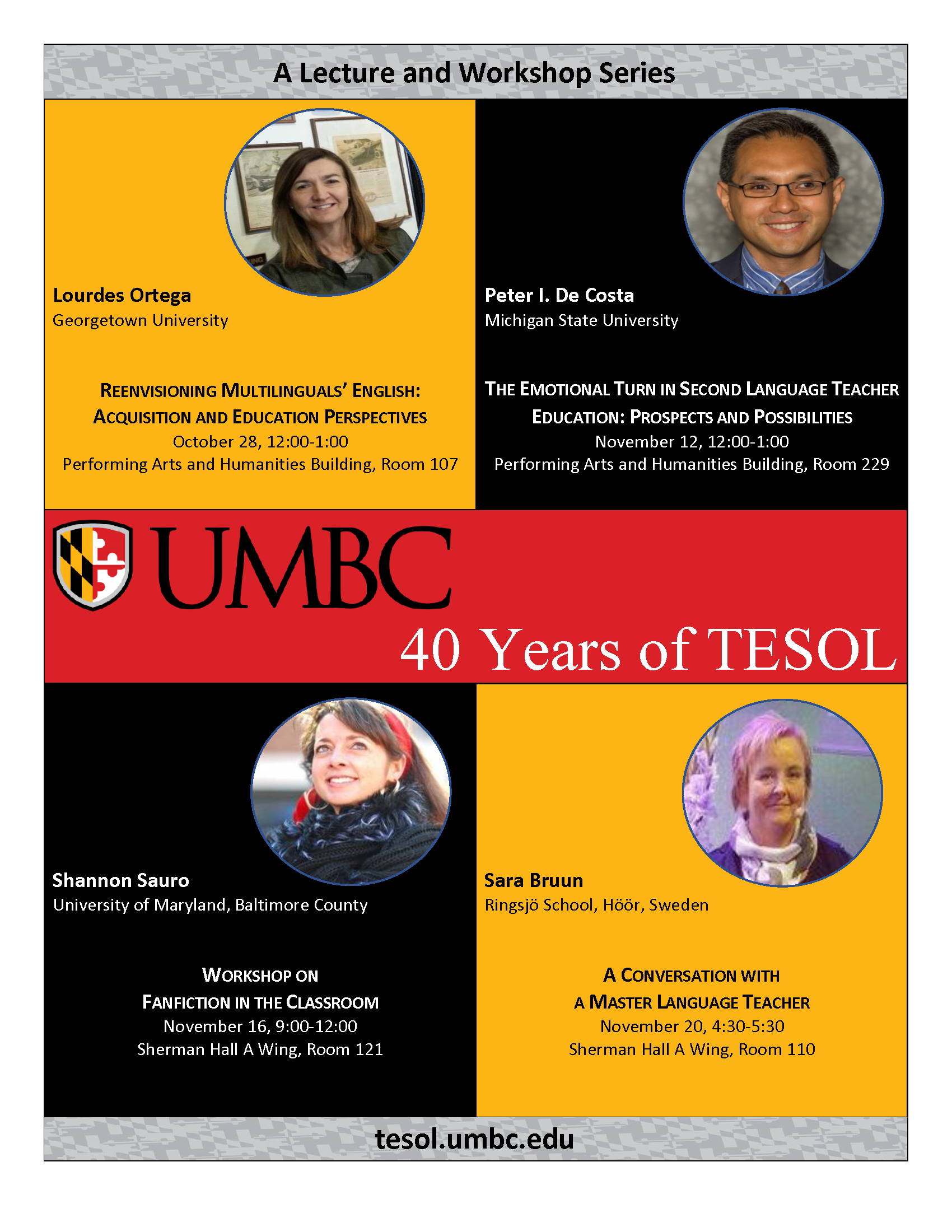 Please join UMBC's Department of Education to celebrate the 40th anniversary of the TESOL program through a series of lectures and workshops.